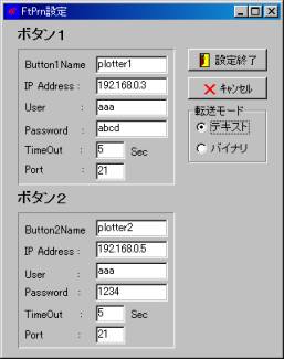このソフトを使用するには左図の設定ウインドで2つのボタンにプリンタを登録する必要があります。設定ウインドウはメインメニューの[設定]で立ち上がります。各ボタンに下記の項目を設定下さい。