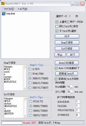 ファイル選択後、[Dxfで保存]または[Dwgで保存]をクリックすればAutoCADが起動し変換が始まります。変換後のバージョンはDwgおよびDxfのラジオボタンで選択できます。