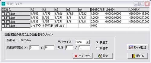 メインウインドウ上のをクリックすると、自動的にAutoCADが起動し、選択されているデータの図面範囲、Dimscaleを取得しA1〜A4の各サイズに印刷した場合の尺度を表示します。