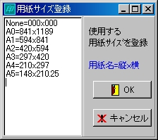 [メニュー]の[設定]→[環境設定]をクリックすると開く環境設定ウインドウの右上にあるボタンをクリックすると用紙サイズ登録ウインドウが開きます。このウインドウで、任意の用紙サイズを登録して下さい。