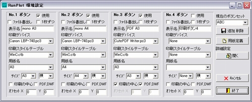印刷ボタンは4個1セットでいくつでも登録可能です。- モデルスペース印刷時には、図面範囲と用紙サイズの関係から、または、DIMSCALE x 係数 にて、自動的に尺度を計算します。さらに、このソフトから各データに用紙サイズx尺度の図面範囲の設定も行うことができます。もちろん、図面に設定されている尺度通りにも印刷が可能です。