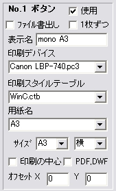 - 印刷ボタンにそれぞれ、印刷デバイス、印刷スタイル、用紙サイズなどの設定を行うので、印刷時にワンタッチで、色々な印刷条件の選択が可能です。